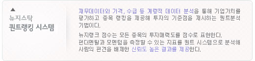 뉴지스탁 퀀트랭킹 시스템을 통해 엔텔스가 모멘텀 94점, 펀더멘탈 71점 등 종합점수 82점을 얻어 28일의 유망종목으로 선정됐다.