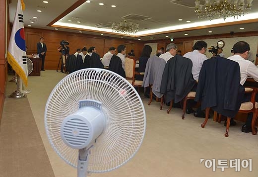 정홍원 국무총리와 국무위원들이 28일 오전 서울 세종로 정부서울청사에서 열린 ‘국가정책조정회의’에서 선풍기를 틀고 회의를 하고 있다. 방인권 기자 bink7119@