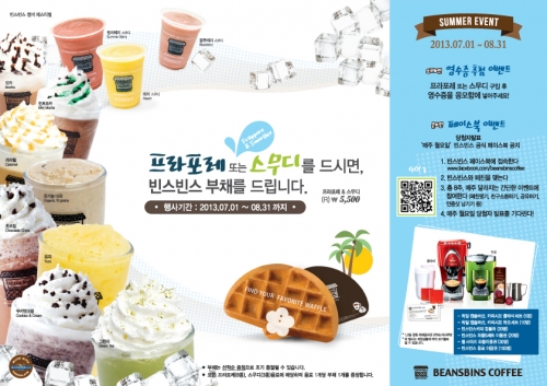 첫번째 이벤트로 쿠키앤크림과 그린티, 민트모카 등 프라포레 8종, 썸머베리와 블루베리, 피치 등 스무디 음료를 구매하면 빈스빈스 부채를 선착순으로 증정한다.