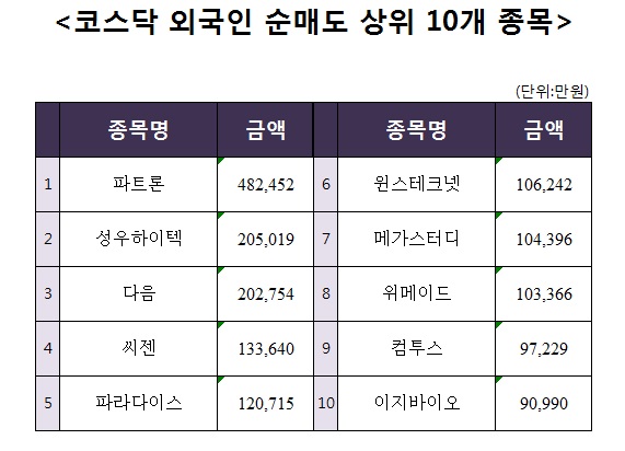 [코스닥 외국인 순매도 상위 10개 종목]