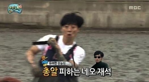 그러다 유재석에게 누군가가 진흙을 던졌고, 유재석은 이를 날렵한 몸놀림으로 피했다.