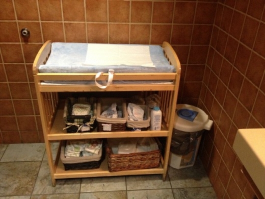 공개된 '착한 아빠용 화장실' 사진에는 종이 기저귀를 비롯해 베이비파우더, 물티슈 등 각종 아기용품이 진열돼 있다.