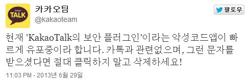 카카오측은 29일 트위터를 통해 "Kakao Talk의 보안 플러그인'이라는 악성코드앱이 빠르게 유포중이라 합니다. 카톡과 관련없으며, 그런 문자를 받으셨다면 절대 클릭하지 말고 삭제하세요!"라는 공지를 하고 있다.