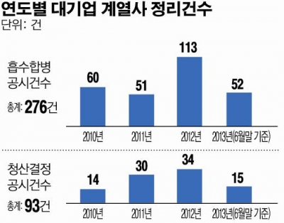 금융감독원 전자공시시스템에 따르면 지난 2010년 이후 올해 6월말까지 대기업집단이 공시한 계열사 흡수합병은 276건에 이른다. 연도별로 보면 2010년 60건, 2011년 51건 등의 수준에 머물렀지만 지난해 113건으로 연평균 건수보다 갑절 이상 늘었다. 올해 들어서도 6월말 기준 52건으로 예년 평균치에 이르는 것으로 확인됐다.