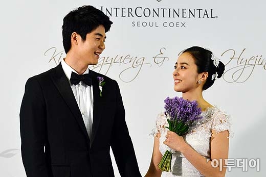 축구선수 기성용(24ㆍ스완지시티)과 배우 한혜진이 1일 오후 서울 강남구 삼성동 인터컨티넨탈 호텔에서 열린 결혼식 기자회견에서 포토타임을 갖고 있다. 방인권 기자 bink7119@