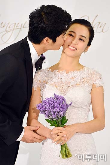 축구선수 기성용(24ㆍ스완지시티)과 배우 한혜진이 1일 오후 서울 강남구 삼성동 인터컨티넨탈 호텔에서 열린 결혼식 기자회견에서 포토타임을 갖고 있다. 방인권 기자 bink7119@