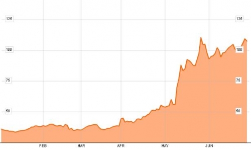테슬라 주가는 지난 6개월간 240% 뛰었으며 지난 2010년 6월 기업공개 이후로는 무려 일곱 배 이상 올랐다.