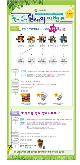 이번 이벤트는 2013년 문화관광형시장이 45개로 확정된 것을 기념하기 위해 마련됐다. 1차 이벤트를 포함해 총 5번의 릴레이 형식의 이벤트가 진행된다.