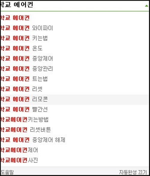 검색 목록에는 ‘학교 에어컨 켜는 법’ ‘학교 에어컨 온도’ ‘학교 에어컨 중앙관리’ ‘학교 에어컨 트는 법’ ‘학교 에어컨 켜는 방법’ 등이 작성돼 여름철 더위를 피하고 싶은 학생들의 절박한 심정을 보여준다.