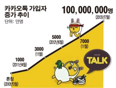 2010년 3월 서비스를 시작한 카카오톡은 2011년 4월 1000만명, 2011년 11월 3000만명, 2012년 6월 5000만명을 돌파한 데 이어 2012년 12월 7000명을 넘어섰다. 점점 가파른 성장세를 보이던 카카오톡은 서비스 오픈 3년3개월만에 가입자 1억명을 돌파했다. 기존 1000만 단위 가입자 증가가 약 4개월 가량 소요된 것을 감안하면 성장세가 최근엔 두배 가까이 빨라졌다.