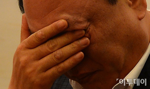 개성공단 입주기업 긴급 대책 회의가 3일 서울 여의도 중소기업중앙회에서 열렸다. 이날 회의에 참석한 배해동 공동위원장이 눈물을 훔치고 있다. 양지웅 기자 yangdoo@