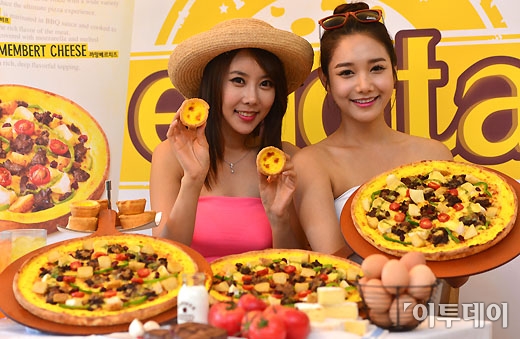 미스터피자가 3일 오전 서울 중구 무교동 청계광장점에서 신제품 '에그타 피자'를 선보이고 있다. 에그타 피자는 소스를 최소화하고 쇠고기 스테이크와 치즈 등의 식재료 본연의 맛을 강조해 담백하면서 고소한 맛을 강조한 제품이다. 양지웅 기자 yangdoo@