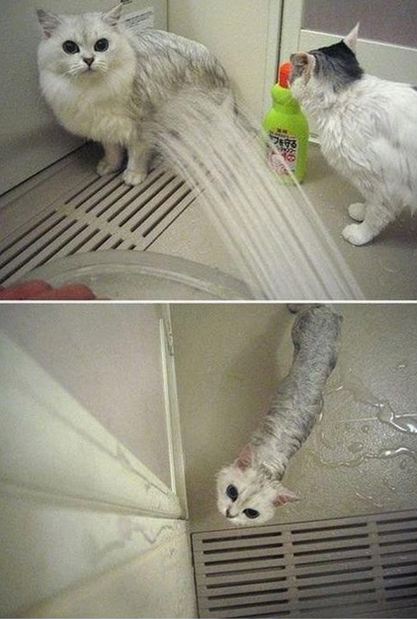 한 장의 사진에는 샤워하기 직전 풍성한 회색털을 가진 고양이 한 마리가 등장한다. 샤워가 끝난 후 다른 한 장의 사진에 이 고양이는 앙상한 모습으로 변해 있다. 털이 물에 젖자 몸통이 고스란히 드러난 것. 때문에 이 사진은 고양이 샤워 다이어트라는 설명이 붙었다.
