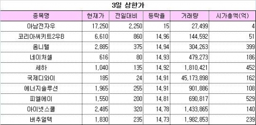 3일 한국거래소에 따르면 유가증권 3개, 코스닥 7개 등 총 10개 종목이 상한가로 마감했다.