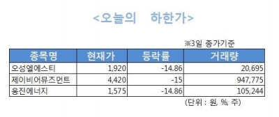 3일 국내 주식시장에서는 유가증권시장 1종목, 코스닥시장 2종목 등 3종목이 하한가로 내려앉았다.
