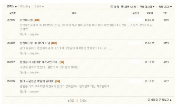 지난해 말부터 한 네티즌은 인터넷 커뮤니티를 통해 "원빈과 이나영이 테니스를 같이 치러 다닌다", "원빈이 이나영을 엄청 좋아하는 것 같다", "둘이 영화관에 자주 온다", "원빈이 철산동에서 이나영 있는 분당으로 이사했고 동거중"이라는 글을 올리며 원빈과 이나영의 열애를 주장했다.