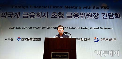 신제윤 금융위원장이 4일 오전 서울 중구 웨스턴 조선호텔에서 열린 ‘외국계 금융회사 초청 금융위원장 간담회’에서 인사말을 하고 있다. 방인권 기자 bink7119@