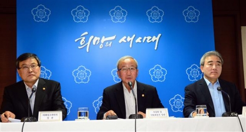 ▲현오석(가운데) 부총리는 4일 서울 여의도 수출입은행에서 열린 ‘서비스산업 정책 추진방안 및 1단계 대책’ 관계부처 합동브리핑에서 “고부가가치를 포함한 2단계 대책도 조만간 마련해 발표할 것”이라고 설명했다. 사진은 왼쪽부터 미래창조과학부 최문기 장관, 현오석 부총리, 문화체육관광부 유진룡 장관.(사진=노진환 기자)