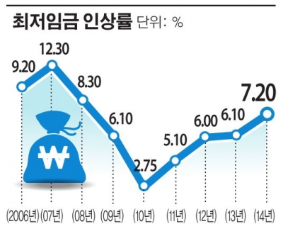 최근 5년 동안 시간당 최저임금 현황은 △2009년 4000원(전년 대비 6.1% ↑) △2010년 4110원(2.75% ↑) △2011년 4320원(5.1% ↑ ) △2012년 4580원(6.0% ↑) △2013년 4860원(6.1% ↑) 등이다.