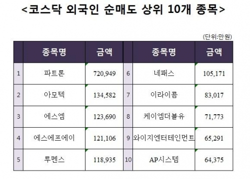 [코스닥 외국인 순매도 상위 10개 종목]