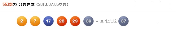 6일 실시된 제553회 나눔로또 추첨 결과 1등 당첨번호는 '2, 7, 17, 28, 29, 39'으로 결정됐다. 보너스 번호는 '37'이다.