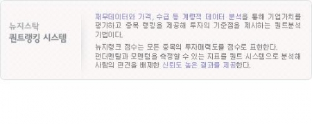 뉴지스탁 퀀트랭킹 시스템을 통해 한세실업이 모멘텀 87점, 펀더멘탈 43점 등 종합점수 65점을 얻어 8일 유망종목에 선정됐다.