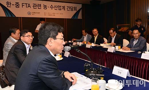 윤상직 산업통상자원부 장관이 8일 오전 서울 서초구 반포동 팔래스 호텔에서 열린 ‘한-중 FTA 관련 농수산업계 간담회’에서 모두발언을 하고 있다. 방인권 기자 bink7119@