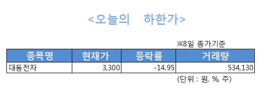 8일 국내 주식시장에서는 코스피 상장사인 대동전자 1종목만 하한가를 기록했다.