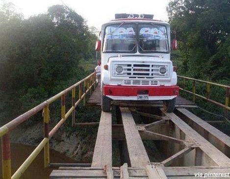 사진을 살펴보면 다리를 지나가는 버스의 보습이 담겨있다. 문제는 버스가 지나가고 있는 상판의 나무들은 부서진 상태라는 점이다. 특히 버스는 다리를 지탱하고 있는 철골을 이용해 지나가고 있다.