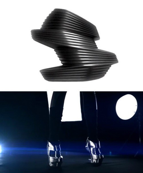 이 하이힐은 이라크 출신의 세계적인 여성 건축가 자자하디드가 디자인한 것으로 크롬으로 도금된 고무와 내파 가죽과 유리섬유 등을 이용해 제작됐다.