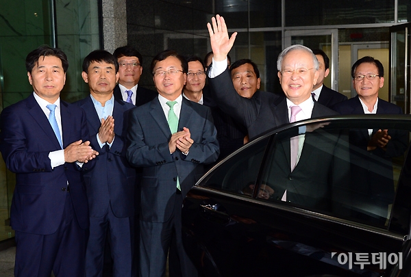 손경식 대한상공회의소 회장이 9일 오후 서울 남대문로 대한상공회의소에서 이임식을 마치고 이동근 부회장과 관계자들의 배웅을 받으며 대한상공회의소를 떠나고 있다. 노진환 기자 myfixer@