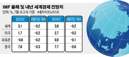 경제 전망을 놓고 한국과 세계의 예측이 엇갈리고 있다. 국제통화기금(IMF)는 9일 올해 세계 경제성장률 전망치를 지난 4월 발표 때보다 0.2% 포인트 낮춰잡았다. 최근 세계 경기의 미약한 회복세를 반영한 결과다. 하지만 같은 날 우리 정부는 한국 경제가 점차 개선될 것이라는 낙관적인 전망을 내놨다. 대외 의존도가 높은 한국 경제 현실을 감안할 때, 박근혜정부가 가계부채에 이어 경기 인식에 있어서도 안이한 시각을 갖고 있는 게 아니냐는 지적이 나온다.