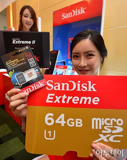 샌디스크가 11일 오전 서울 강남구 삼성동 코엑스 인터컨티넨탈 호텔에서 초당 80MB 읽기 및 50MB의 쓰기가 가능한 64GB 마이크로 SDXC카드와 고성능 샌디스크 익스트림 II SSD, 고성능 USB 3.0 플래시 드라이브를 선보이고 있다. 방인권 기자 bink7119@