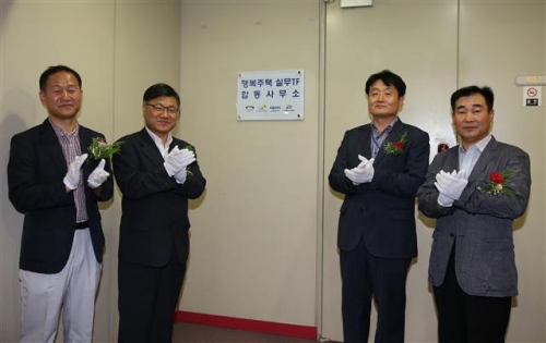 ▲좌측부터 한광덕 한국철도공사 자산개발단장, 정인억 한국토지주택공사 부사장, 한창섭 국토교통부 공공주택건설단장, 윤충원 한국철도시설공단 행복주택사업처장 (사진=LH)