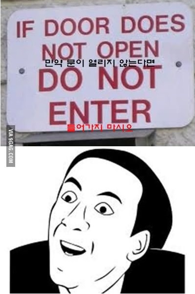 즉 문이 안열리니 들어오지 말라는 의미다. 특히 경고문 아래 있는 그림의 남성의 표정이 웃음을 자아내고 있다.