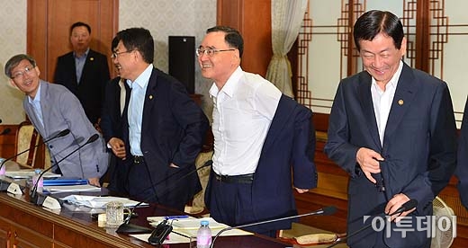 정홍원 국무총리와 국무위원들이 12일 오전 서울 세종로 정부서울청사에서 열린 '국가정책조정회의’에서 자켓을 탈의하고 있다. 방인권 기자 bink7119@