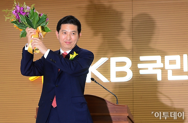 임영록 KB금융그룹 회장이 12일 오전 여의도 KB국민은행 본점에서 열린 취임식에서 꽃다발을 들고 미소를 짓고 있다. 노진환 기자 myfixer@