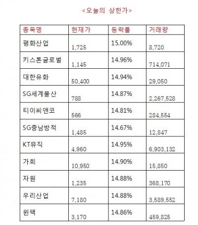 이밖에도 KT뮤직(14.95%), 가희(14.90%), 티이씨앤코(14.81%), 평화산업(15.00%), SG충남방적(14.67%) 등이 상한가를 기록했다.