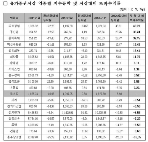 15일 한국거래소에 따르면 올 초부터 7월 11일 현재까지 유가증권시장 업종별 지수등락률 및 시가총액 비중 변동추이를 조사한 결과, 11개 업종은 시장대비 초과 수익을 기록했고 7개 업종은 시장대비 하락한 것으로 집계됐다. 이 기간 코스피지수는 5.98% 하락했다.