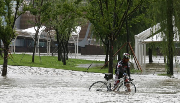 중북부지역에 집중호우가 내린 지난 14일 서울 반포한강공원에서 자전거를 타던 한 시민이 갑자기 불어난 물을 피해 이동하고 있다.