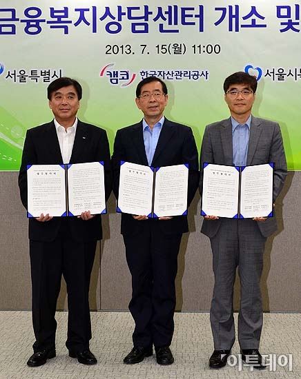 박원순 서울시장과, 임성규 서울시복지재단 대표(오른쪽), 장영철 한국자산관리공사 사장이 15일 오전 서울시청 영상회의실에서 열린 ‘서울금융복지상담센터 개소 및 협약식’에서 협약식을 마친 뒤 기념촬영을 하고 있다. 서울금융복지상담센터는 서울시민의 금융관련상담을 비롯한 복지서비스 연계, 법률상담 등을 제공하는 금융복지서비스 전문기관이가. 방인권 기자 bink7119@