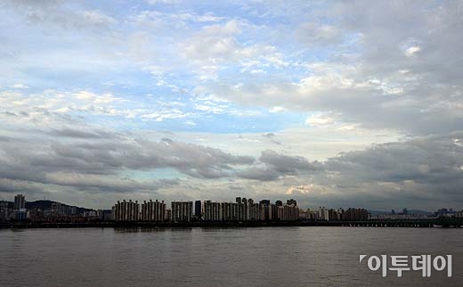 집중호우가 잠시 소강상태를 보인 15일 오후 서울 여의도 63빌딩에서 바라본 하늘이 비구름이 걷히며 맑은 하늘을 보이고 있다. 방인권 기자 bink7119@
