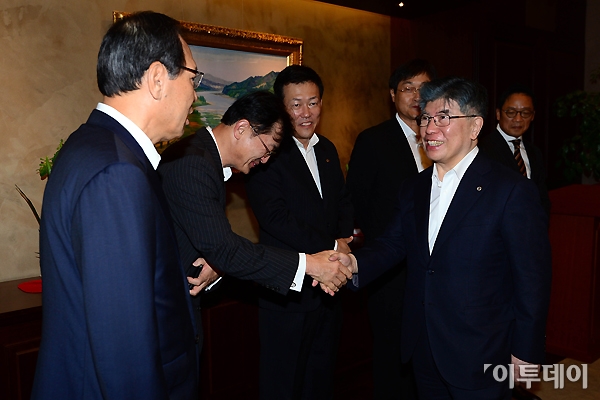 김중수 한국은행 총재가 16일 오전 남대문로 한국은행 본관에서 열린 비은행금융기관 CEO 협의회에서 참석자들과 인사하고 있다. 노진환 기자 myfixer@