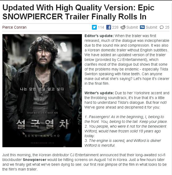 이 같은 인기를 입증하듯 ‘설국열차’는 지난 9일 미국 영화 데이터베이스 사이트 IMDB의 메인 화면을 장식했다. 또 미국 유명 영화 정보 사이트 ‘퍼스트쇼잉닷넷’은 “‘설국열차’의 또 다른 예고편은 충분해 보인다(Another Excellent New Trailer for 'Snowpiercer' Shows Just Enough)”라는 타이틀로 기대감을 드러냈다.