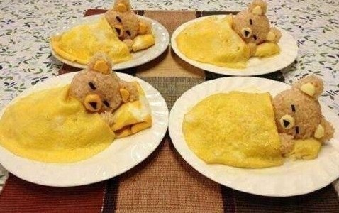 실제로 사진을 면밀히 보면 곰이 이불을 덮고 있는 모습을 취하고 있는 '일본 신개념 오므라이스'는 곰의 베개와 이불을 달걀 부침으로 만들었다.