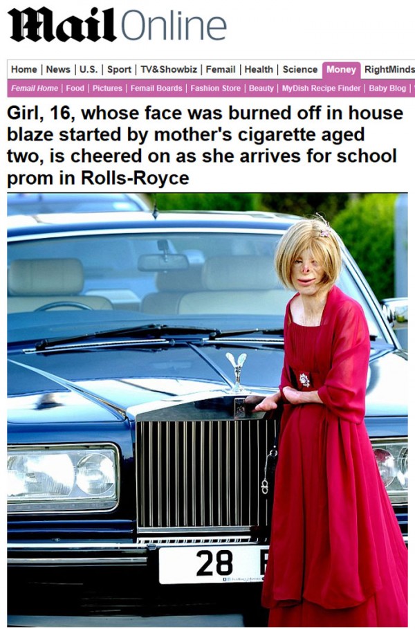 14년전 얼굴을 포함한 전신에 90퍼센트 이상의 화상을 입고도 기적적으로 생존한 테리 칼베스버트(16)의 최근 모습을 영국 매체 데일리 메일이 15일 보도했다. 두살 때 집에 일어난 화재로 중화상을 입고 겨우 목숨을 건진 칼베스버트는 이후 수십여차례의 수술에도 불구, 한 쪽 다리와 열 손가락, 코와 양쪽 귀 등을 모두 잃었다. 데일리 메일은 칼베스버트의 근황과 함께 최근 고교 졸업파티에 밝은 모습으로 참석한 모습을 싣고, 앞으로 대학에 진학에 동물보호에 대해 공부하고 싶다는 그녀의 바람을 전했다.