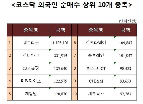 [코스닥 외국인 순매수 상위 10개 종목]