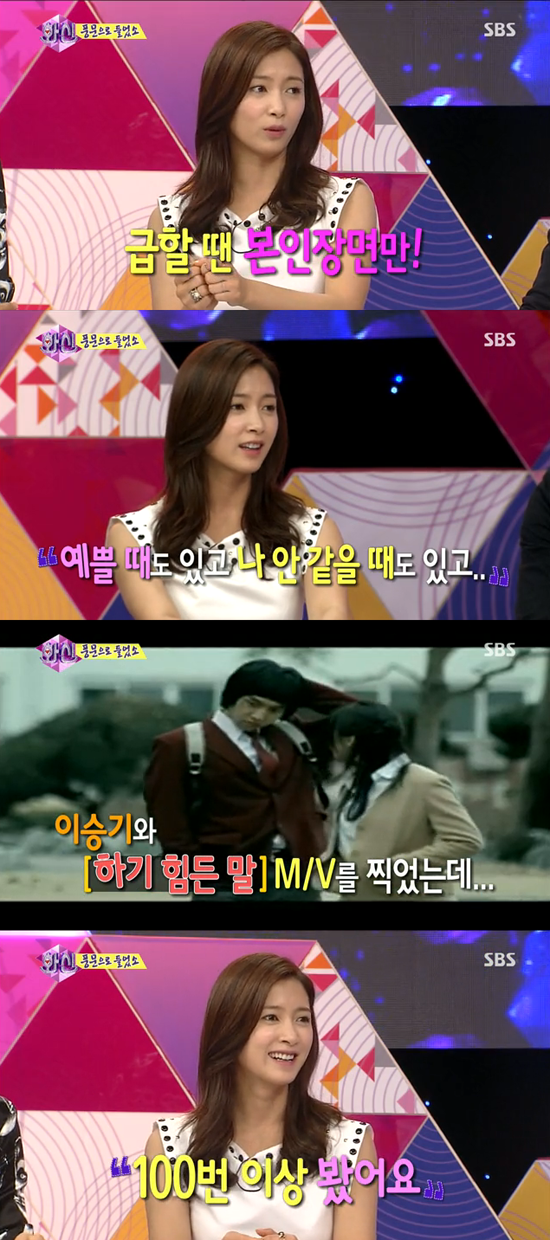 이어 그녀는 “100번 이상 본 것도 있나?”라는 MC 신동엽의 말에 “이승기와 ‘하기 힘든 말’ 뮤직비디오를 찍었는데 이런 식으로 나간다고 CD로 구워서 줬다. 백번 넘게 봤다”고 전했다.