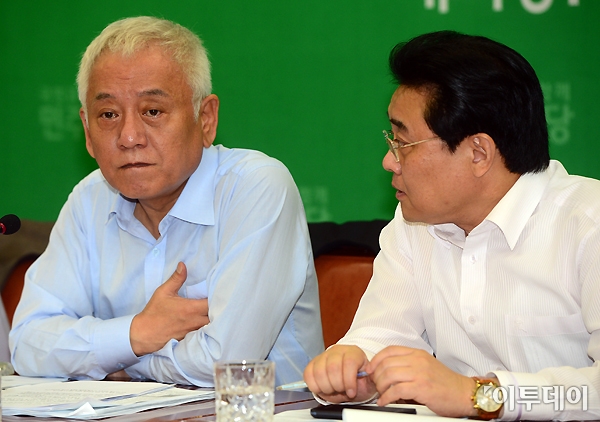김한길 민주당 대표와 전병헌 원내대표가 17일 오전 국회 당대표실에서 열린 최고위원회의에 참석해 이야기를 나누고 있다. 노진환 기자 myfixer@