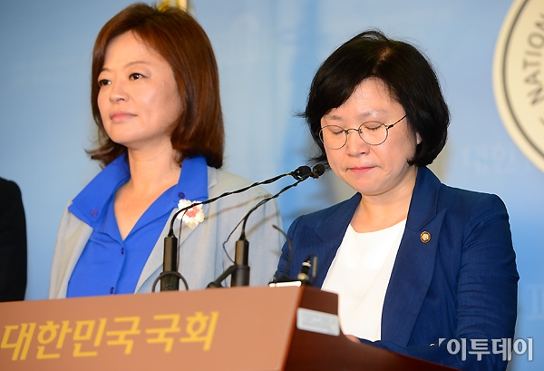 김현, 진선미 민주당 의원이 국정원 국정조사 특위 위원직 사퇴의사를 밝힌 뒤 17일 오전 국회 정론관에서 기자회견을 갖고 있다. 새누리당은 국정조사의 전제조건으로 두 의원의 위원직 사퇴를 주장해왔다. 노진환 기자 myfixer@
